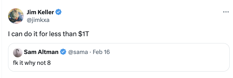 今天,硅谷芯片大神吉姆・凯勒(Jim Keller)在社交平台X上回复OpenAI CEO萨姆·阿尔特曼(Sam Altman)筹集5-7万亿美元制造AI芯片的计划,吉姆・凯勒称,他可以用不到1万亿美元做到这一点。