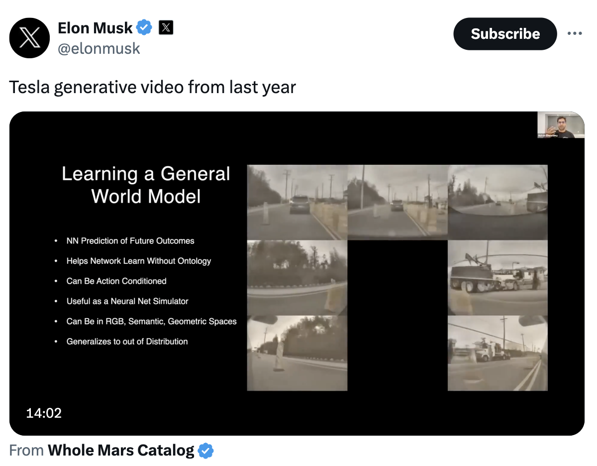 1、马斯克:特斯拉一年前就可生成真实世界视频