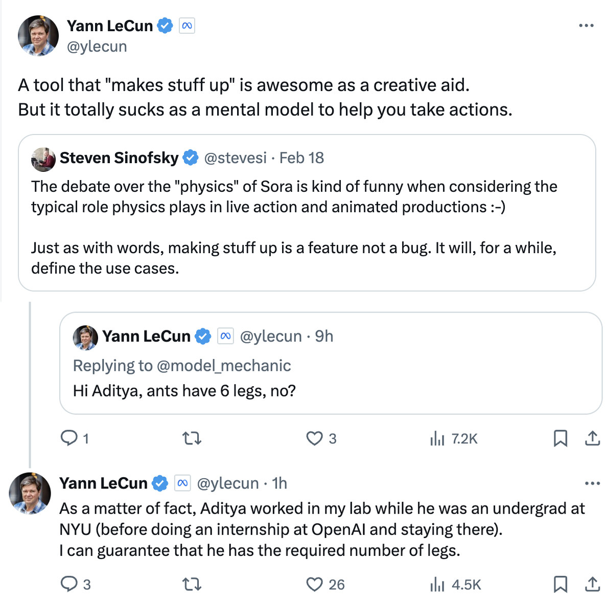 今天,Meta首席AI科学家杨立昆在社交平台X上发文评价Sora,一个“创造东西”的工具作为创造性的辅助工具是非常棒的。“但作为帮助人们采取行动的心理模型,它完全很糟糕。”并且针对OpenAI Sora生成的“蚂蚁穿梭蚁巢特写”视频中,蚂蚁只有4条腿,杨立昆发文喊话Sora团队负责人Aditya Ramesh:“蚂蚁有六条腿,不是吗?”杨立昆称,Aditya在纽约大学读本科时就在他的实验室工作过,之后在OpenAI实习并留下任职。2月17日,杨立昆曾发文称:“根据提示生成看起来最真实的视频并不表明系统能理解物理世界,生成与世界模型的因果预测有很大不同。”