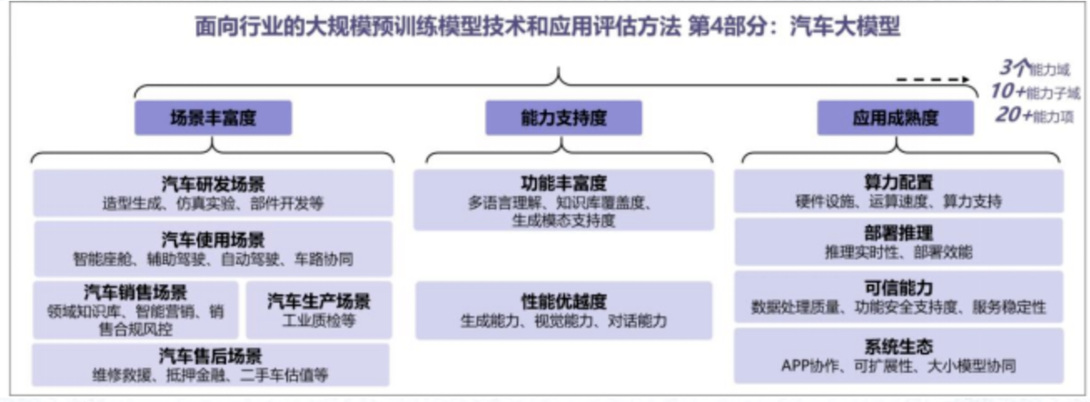 今天,依托于中国信息通信研究院开展的第三方评估测试平台“可信AI评测”宣布,中国信通院可信AI汽车大模型首批标准符合性验证正式启动。此前,中国信息通信研究院联合业内30余家单位共同编制了《面向行业的大规模预训练模型技术和应用评估方法 第4部分:汽车大模型》标准,此次验证工作主要面向汽车大模型相关解决方案的应用单位和技术提供单位。应用方可评估汽车大模型的应用效能,对已应用或拟采用的汽车大模型产品进行评估。同时,技术方可对产品能力进行摸底。