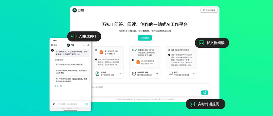 智东西5月9日报道,国内AI大模型独角兽企业零一万物本周二发布了其首款一站式AI工作平台“万知”,PC网页版和微信小程序版均可用。它可以做会议纪要、周报、写作助手、PPT,还可以解读财报、论文等各类文件,支持中英双语,完全免费。