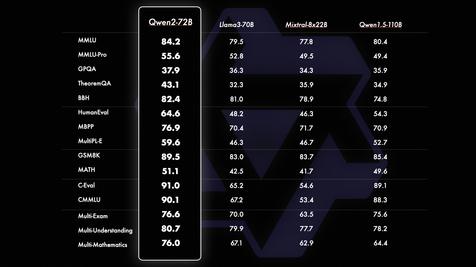 ▲Qwen2-72B在十几个全球权威测试中超过当前最优开源模型