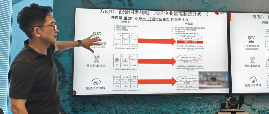 红帽认为,开源是重塑行业技术、打通行业生态的重要推力。在工业控制、通讯技术、信息技术等领域,AI转型能满足行业功能性能的要求同时实现软硬解耦,消除硬件及系统层面的行业壁垒,从而增加灵活性,为应用层的场景爆发提供先决条件。