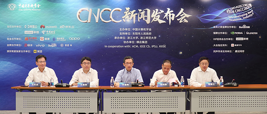 CNCC2024指导委员会主席、CCF理事长,中国工程院院士,中国科学院计算所研究员孙凝晖;程序委员会主席,北京大学教授胡振江;论坛委员会主席、CCF常务理事,中国人民大学教授文继荣;组织委员会副主席,东阳市委常委、横店镇党委书记胡利群;组织委员会共同主席,横店集团党委书记、董事、副总裁吕跃龙等嘉宾出席发布会。发布会由CNCC2024大会总监、CCF秘书长唐卫清主持。