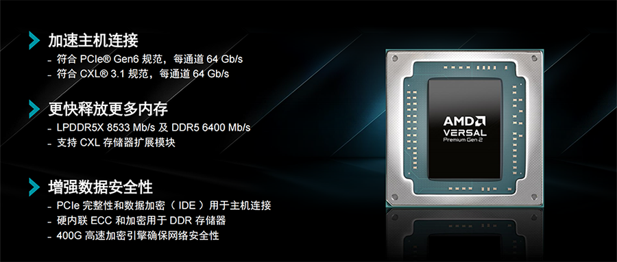 相比第一代产品,第二代AMD Versal Premium系列有三大创新:一是加速主机连接,二是更快释放更多内存,三是增强数据安全性。