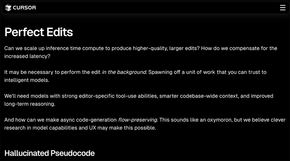 比较有意思的是,Cursor每年会发一篇博客文章,描述希望解决的问题列表。2023年列出的问题有更好上下文、编辑Copilot、主动查错、更大编辑范畴等,2024年列出的包括下一步行动预测、完美编辑、最佳语境、错误检测和调试。