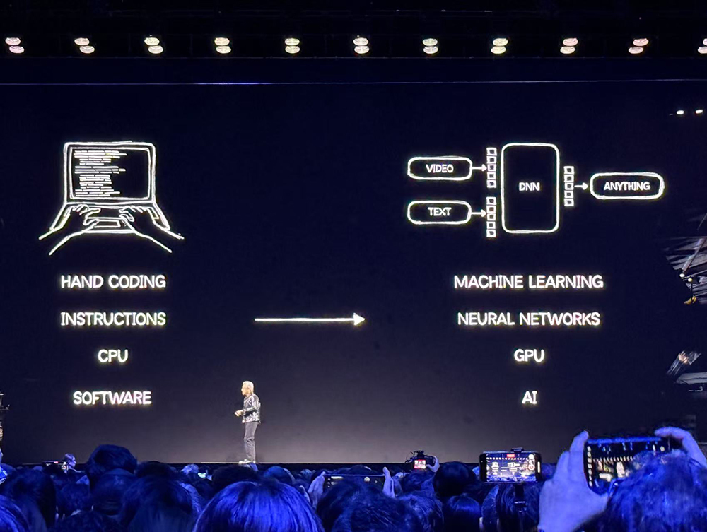 18:42,热场音乐戛然而止,会场霎时从人声鼎沸转为屏息凝神,一段开场视频后,黄仁勋穿了件闪亮的新皮衣,意气风发地走上演讲台,与现场观众寒暄。