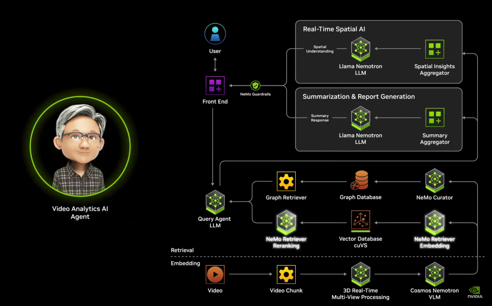 另一个用于视频搜索和总结,构建于Metropolis平台上,由Cosmos Nemotron视觉语言模型、Llama Nemotron大语言模型和NeMo Retriever进行强化,提供了构建和部署可分析大量视频和图像内容的AI agents的工具。