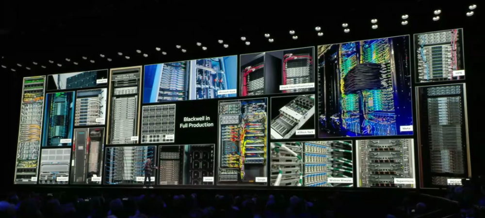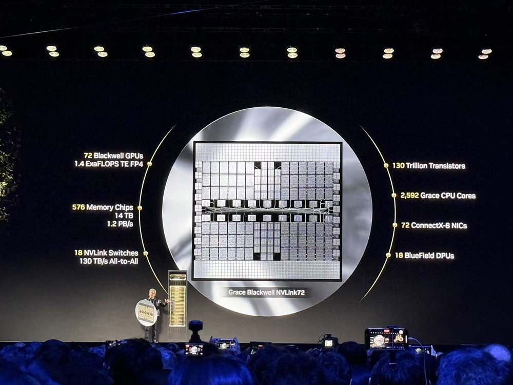 光是在硬件上,黄仁勋就接连整活儿,先搬出一个由72块Blackwell GPU组成的NVLink72巨型“盾牌”,并现场cosplay起美国队长,引起现场观众的欢呼。