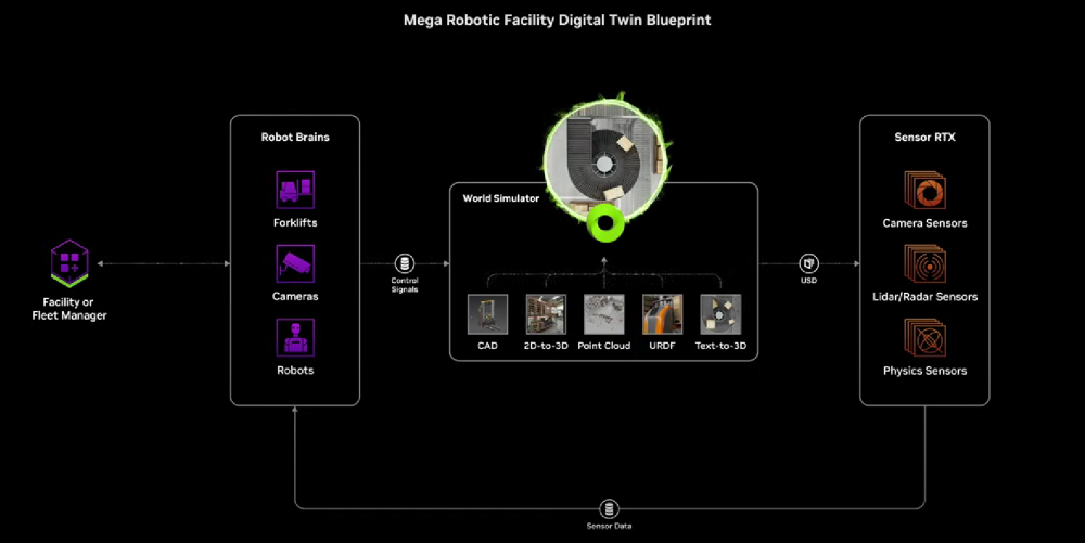 其中Mega为企业提供包含NVIDIA加速计算、AI、Isaac和Omniverse技术的参考架构,用于开发和测试数字孪生,用于测试驱动机器人、视频分析AI agents、设备等的AI驱动机器人大脑,以处理巨大的复杂性和规模。