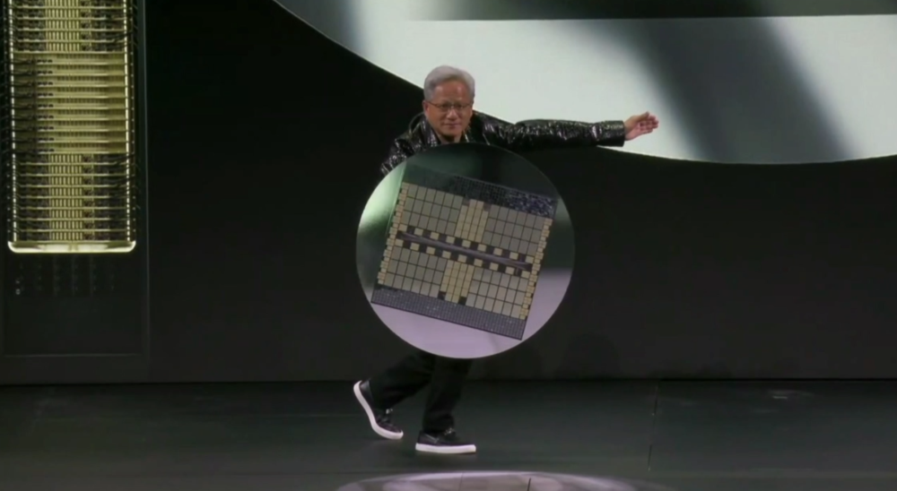 黄仁勋也不负众望,主打一个都不白来,演讲过程中频频整活儿,先是不吊胃口公布RTX50系列显卡的价格,又掏出一张巨型芯片盾牌cosplay美国队长,还玩起把AI超算变小的“魔术”。
