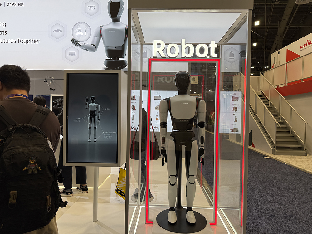 多家国内企业把机器人搬到了CES展会上,智东西看到的人形机器人实体有灵宝CASBOT01、加速进化T1、宇树Unitree G1等。云深处、宇树科技则都在现场展示了机器狗翻跟头。