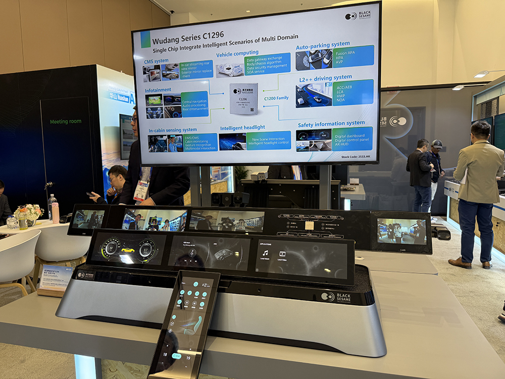 据展位讲解人员介绍,黑芝麻智能的武当C1200系列是行业首款实现座舱、智驾等功能域跨域融合的单芯片。其展位也展出了基于武当C1296芯片的舱驾一体方案,还现场演示了武当C1296的硬隔离演示、大语言模型交互及AI Agent应用。