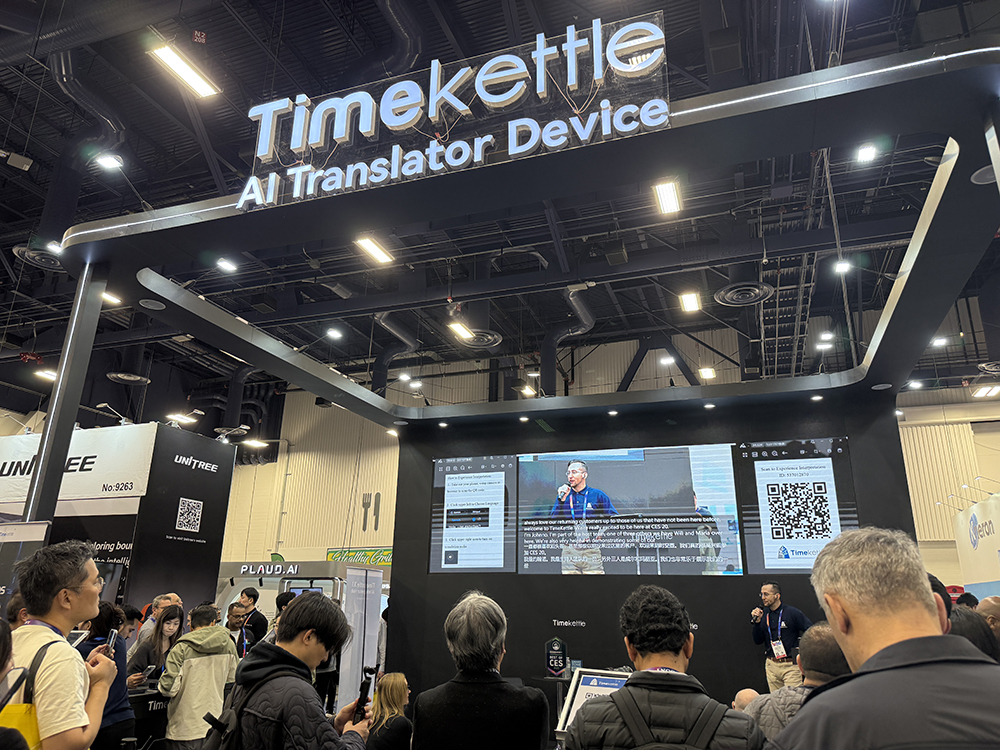 时空壶的AI翻译设备展位围了不少人,很多老外询问和体验其AI翻译耳机。展出AI录音机的PLAUD.AI展台,也一直有络绎不绝的观众来交流。