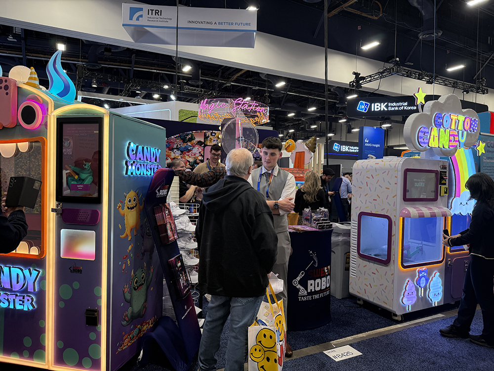 Sweet Robo的展位宛如童话世界,摆放着七彩斑斓的机器人自动售货机、冰淇淋机和糖果机。该公司在今年的CES上推出了一台AI自动售货机,只用90秒就能制作出一个定制的手机壳。
