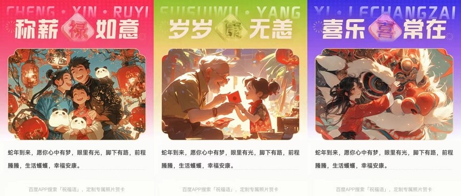 现在,只需要在百度搜索“祝福语”,再点击“做贺卡”,按照自己的需求调整文案后,选择“创意照片”,就能定制各种脑洞大开、趣味十足的新年祝福卡片。