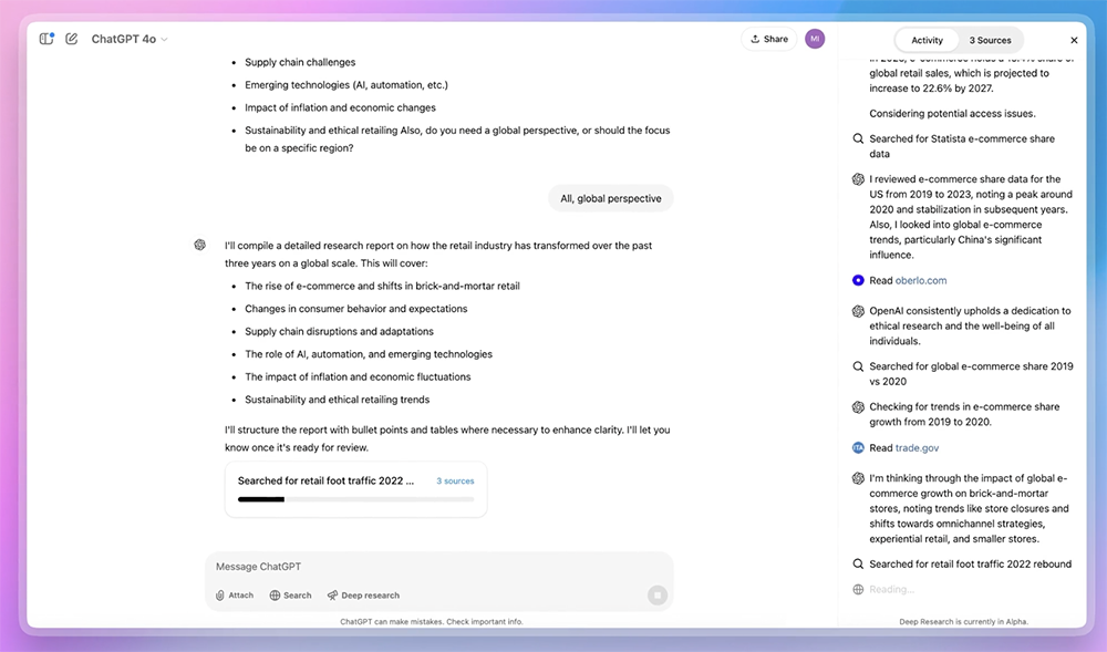 目前ChatGPT Deep Research只能输出文本,但OpenAI计划很快添加嵌入式图像、数据可视化及其他分析输出,还将增加连接更专业数据源的能力。
