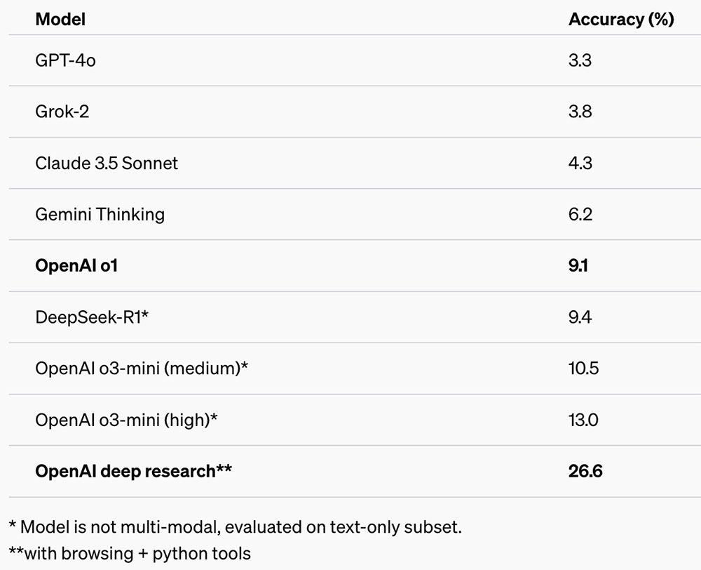 在高难度AI评估“人类最后的考试”中,Deep Research取得断层第一。该评估包含100多个主题的3000个专家级问题,Deep Research的准确率是26.6%,而o3-mini是13%,DeepSeek-R1是9.4%,GPT-4o只有3.3%。