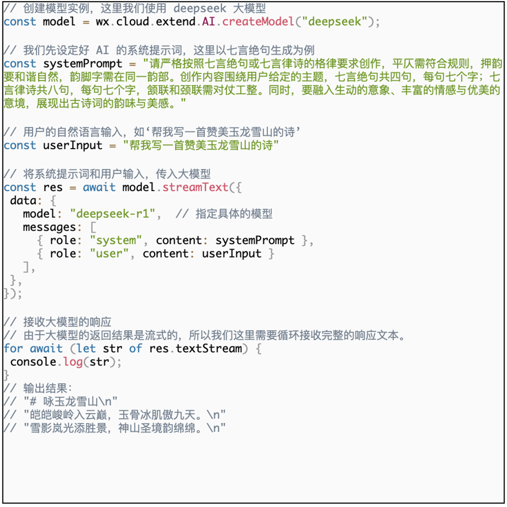 仅需几行小程序代码,就可以通过云开发直接调用大模型的文本生成能力。