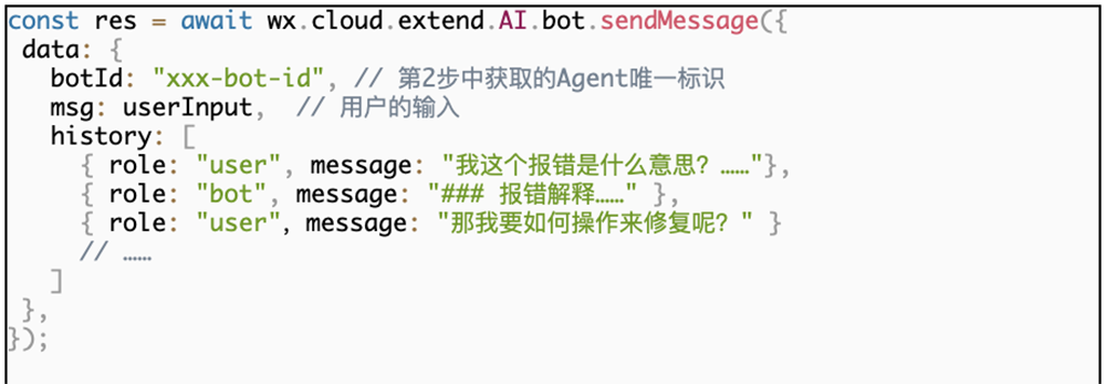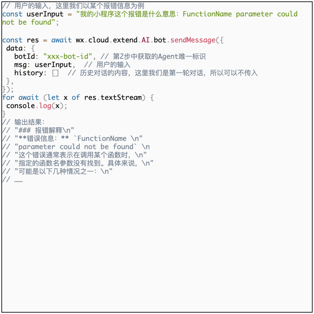 在小程序中,使用以下代码直接调用刚刚我们创建的Agent,进行对话: