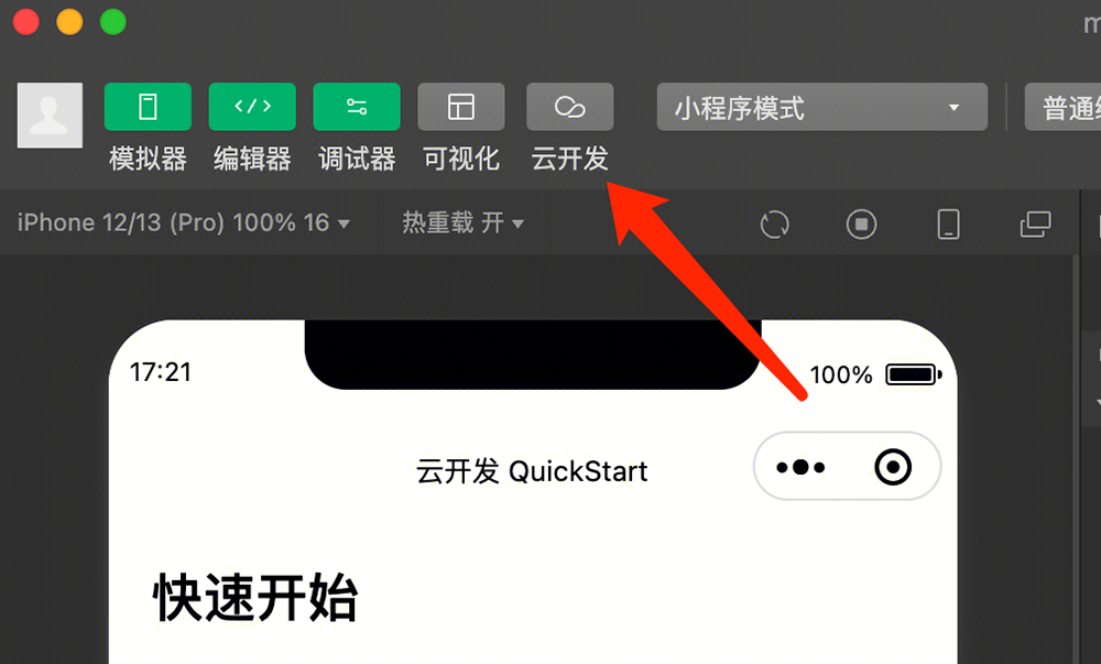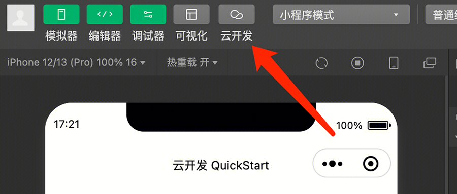 3、小程序需要开通「云开发」,可在小程序开发工具中点击工具栏里的「云开发」按钮进行开通,并创建环境(PS:对于首次使用云开发的用户,第一个月套餐免费):