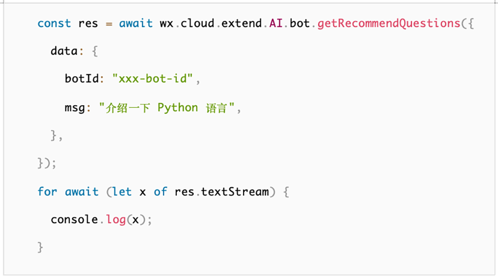 在 data 参数中设置 botId 和用户消息 msg,通过遍历 textStream 获取推荐问题。