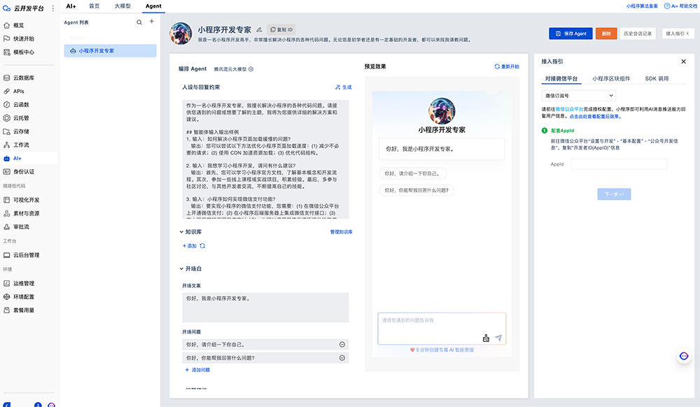 云开发的AI能力不仅提供了原始的大模型接入,还提供了Agent接入的能力,开发者可以在云开发上定义自己的Agent,然后通过小程序直接调用Agent进行对话。