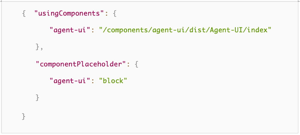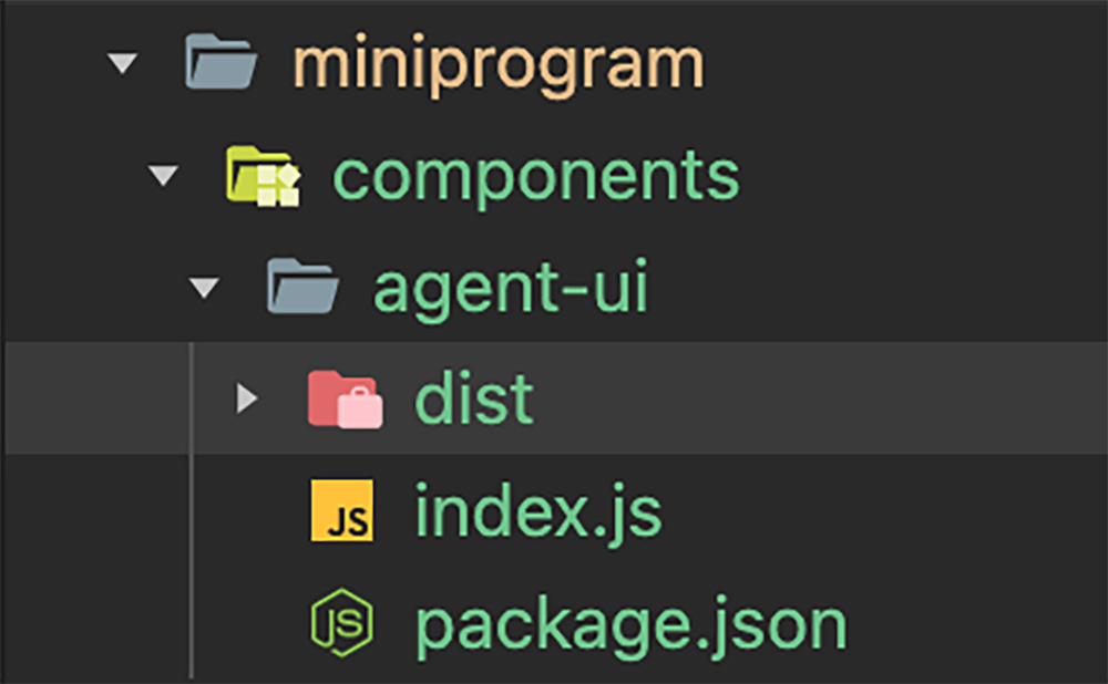 下载组件包后,解压,然后将组件包放入小程序项目内,假设放在小程序根目录下的components/agent-ui目录下: