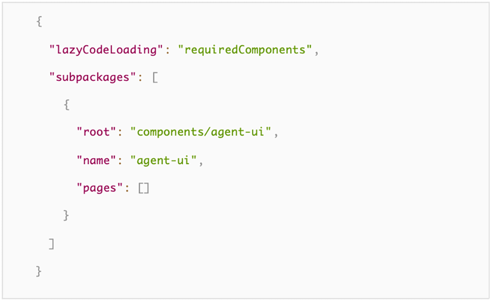 由于对话组件的体积较大,开发者使用小程序子包的形式来引入。在小程序项目的app.json中,我们引入组件包: