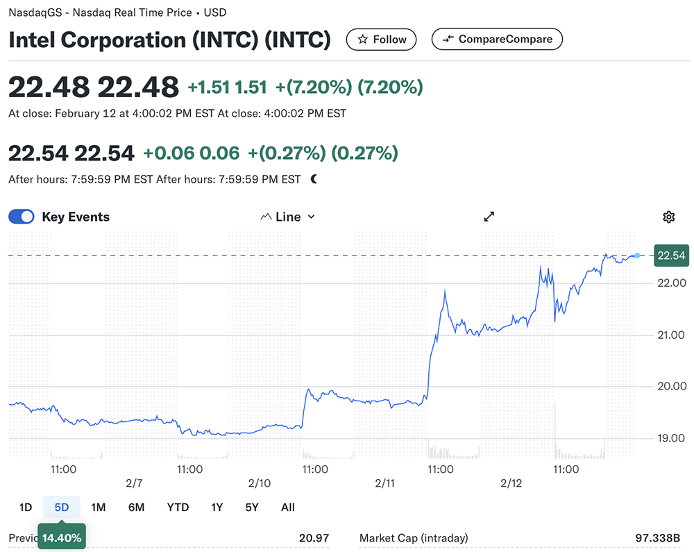 受此消息提振,英特尔股价连续两天大涨。前一天大涨是受美国副总统万斯在巴黎AI行动峰会上发言的影响,万斯称“特朗普政府将确保最强大的AI系统在美国建立,并使用美国设计和制造的芯片。”