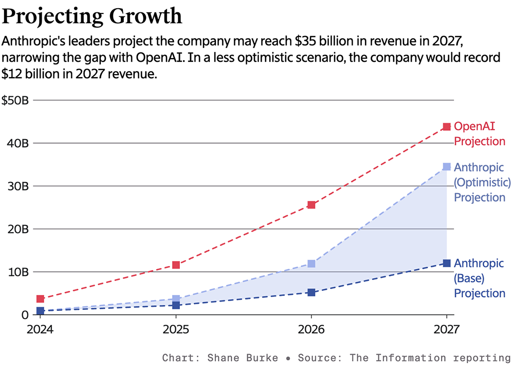 ▲Anthropic高层预计到2027年缩小与OpenAI的收入差距(图源:The Information)