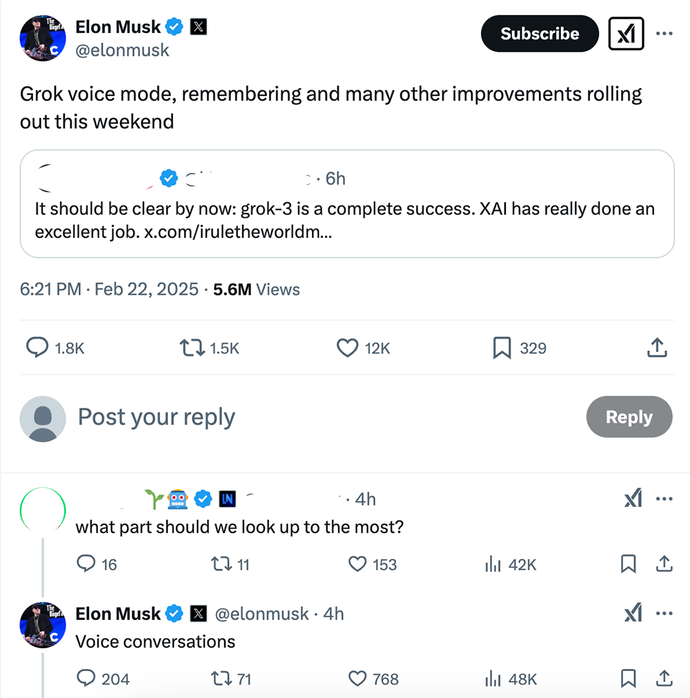 1、xAI:Grok 3这周末推出语音、记忆等功能