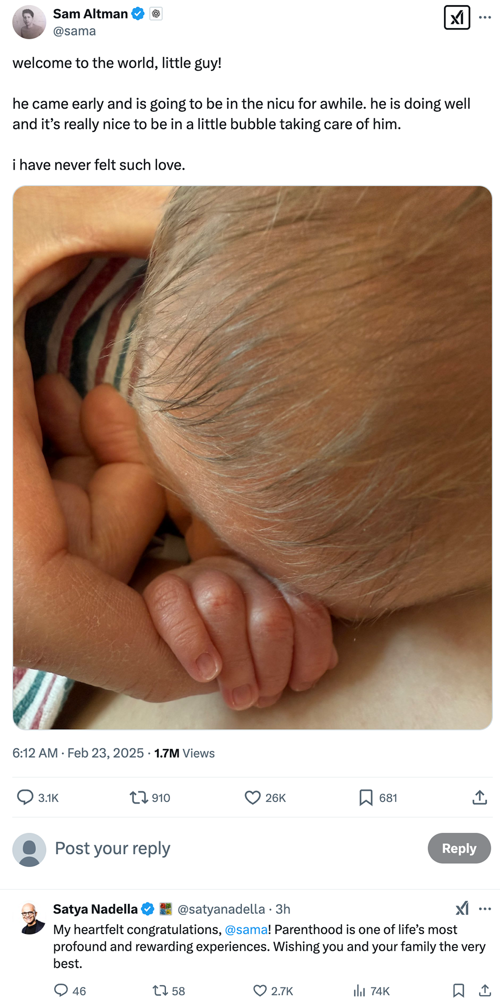 Altman发推文说:“欢迎来到这个世界,小家伙!他提前出生,将在新生儿重症监护室待一段时间。他做得很好,在小泡泡里照顾他真好。我从未感受到这样的爱。”微软董事长兼CEO Satya Nadella立即道贺,评论说为人父母是人生最深刻和最有意义的经历之一,祝Altman和家人一切顺利。
