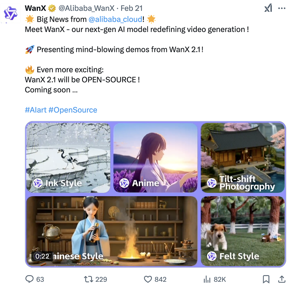 2月21日,阿里云宣布其新一代AI视频生成模型通义万相WanX 2.1将开源。