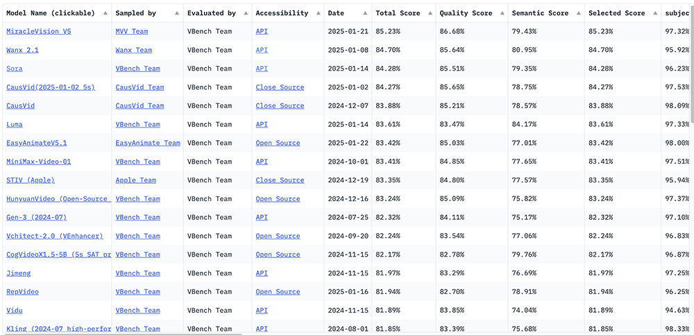 通义万相网站在1月已上线文生视频2.1专业版、极速版。在视频模型基准测试Vbench上,WanX 2.1目前排名第二,仅次于美图奇想大模型Miracle Vision V5,高于OpenAI的Sora、Adobe的CausVid、Luma、阿里云EasyAnimateV5.1、MiniMax-Video-01、苹果STIV等。