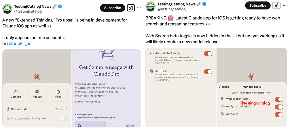 随后德国新媒体晒出“使用扩展思考”(Pro版)和“联网搜索”的测试版选项出现在Claude iOS app界面的截图。