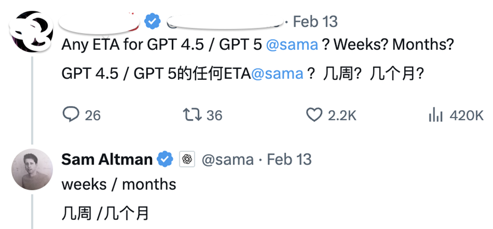 此前OpenAI联合创始人兼CEO Sam Altman发推文公布大模型路线图更新,并回复网友说GPT-4.5将在几周内发布,GPT-5将在几个月内发布。