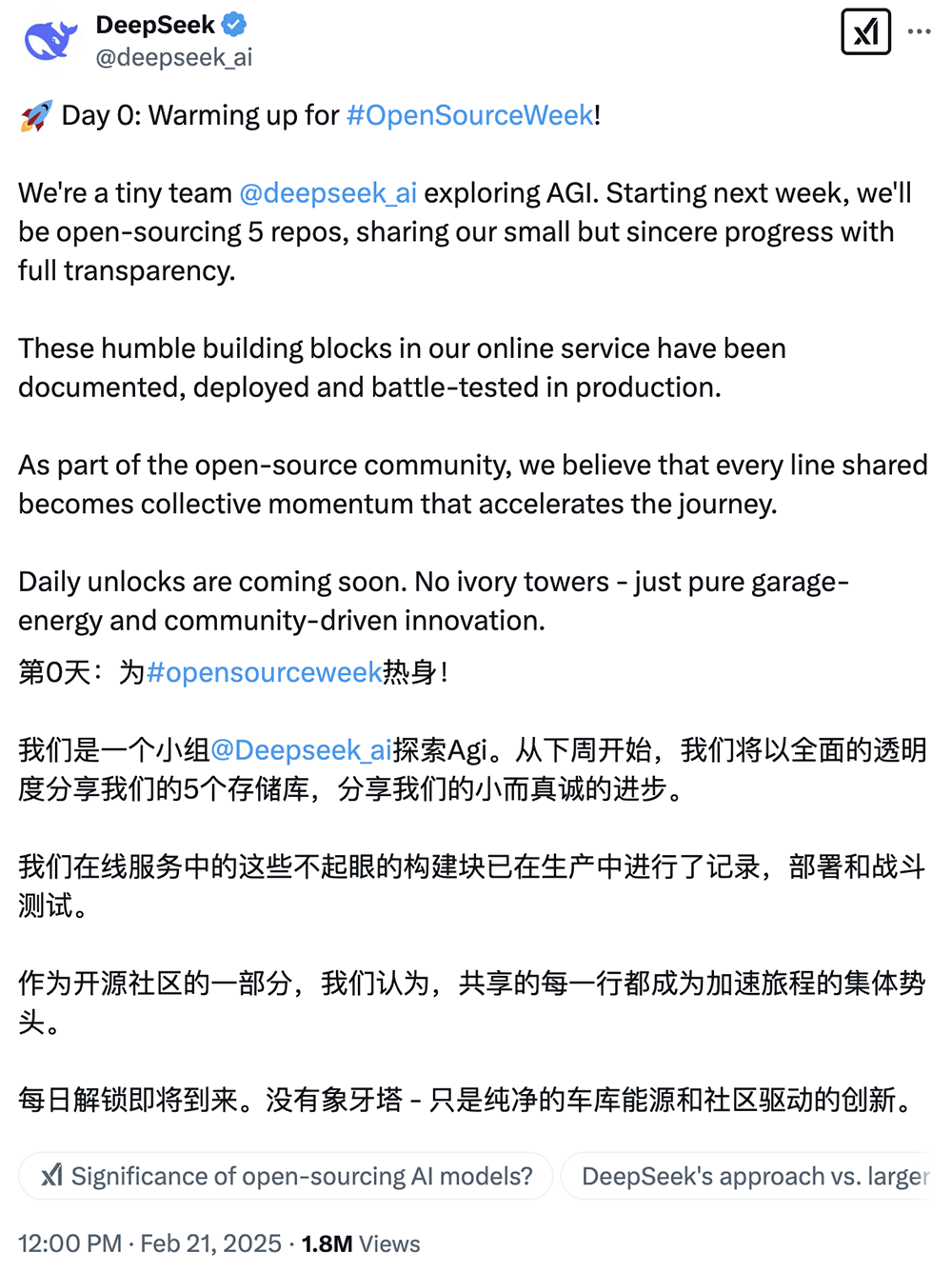 2月21日,DeepSeek发推文宣布,从下周开始将开源5个代码库,以完全透明的方式分享微小但真诚的进展,这些在DeepSeek在线服务中的构建块已在生产中记录、部署和实战测试,每日解锁即将到来。