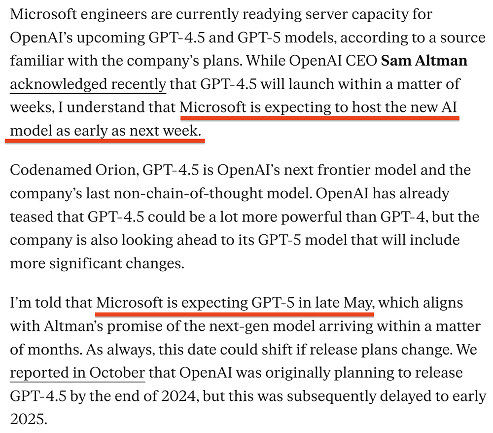 2月21日,据The Verge报道,GPT-4.5可能最早在下周推出。知情人士称,微软正为OpenAI即将推出的GPT-4.5和GPT-5模型准备服务器容量,预计最早将于下周托管新的AI模型,GPT-5将于5月下旬发布。