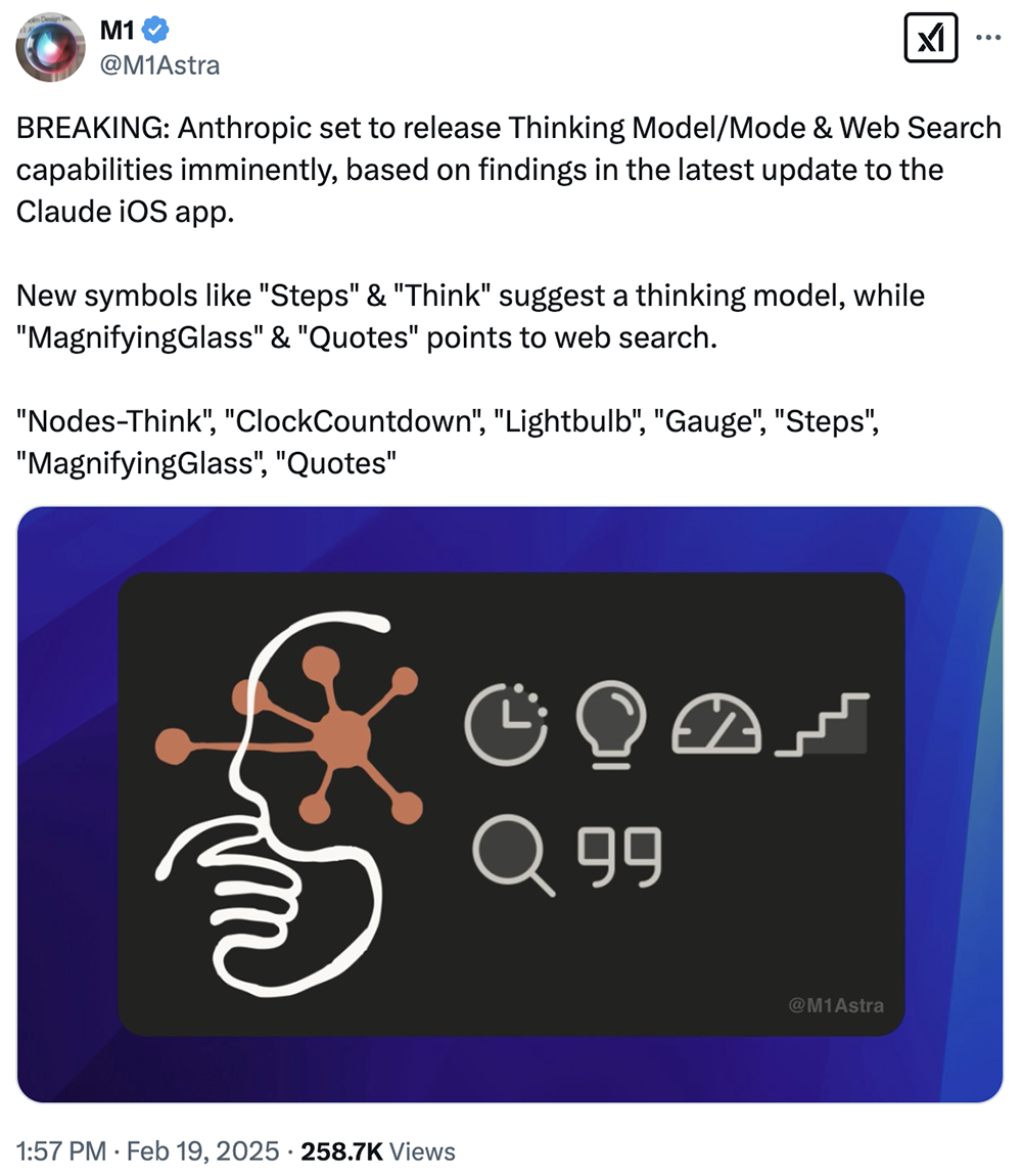 2月19日,社交平台X用户M1发文称,Claude iOS应用程序的最新更新显示,Anthropic即将发布思考模型和联网搜索功能。其中“楼梯”、“思考”等符号暗示思考模型,“放大镜”、“引号”指向联网搜索。
