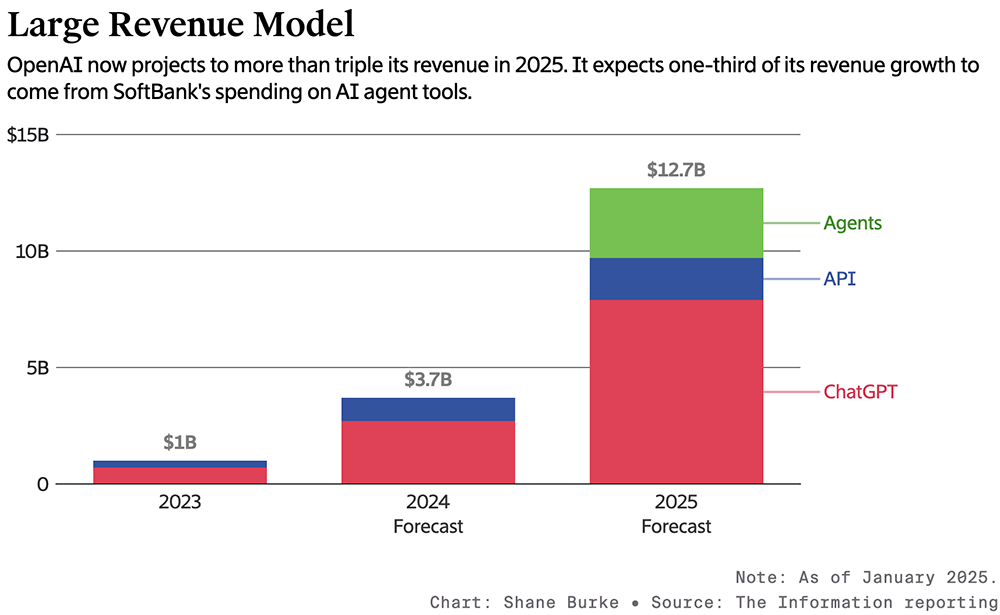 OpenAI告知投资者,预计今年的收入将增长2倍以上,从37亿美元增至125亿美元以上;到2026年将达到280亿美元;预计2025年和2026年的大部分收入将来自ChatGPT,其余来自软件开发工具和AI Agents。