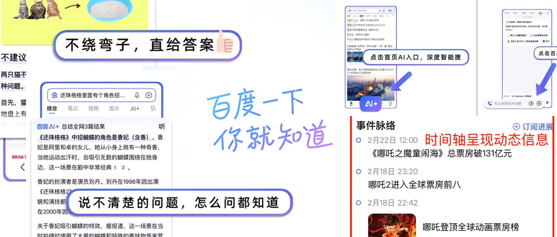 新闻事件发生有一个重要特点,会随着时间变化而不断发展演变、逐渐呈现出更多细节和全貌,这也是AI梳理全网信息并加以总结呈现的重要场景。当我搜索哪吒2票房时,可以在搜索结果中看到贴吧、带时间轴的事件脉络发展等。