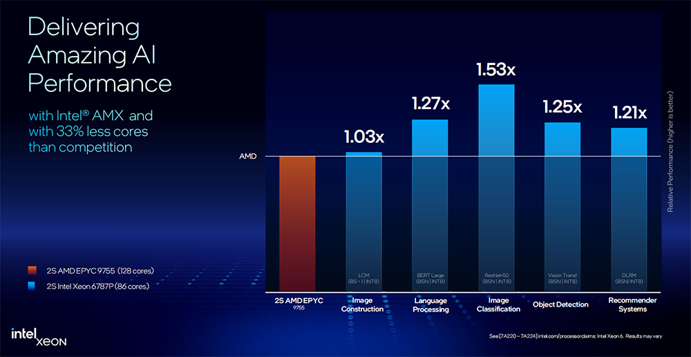至强6内置有AI加速器AMX(高级矩阵扩展)。86核的至强6787P处理器在运行AI工作负载时,性能可配备128核AMD EPYC 9755,在图片分类任务中性能提升多达53%。
