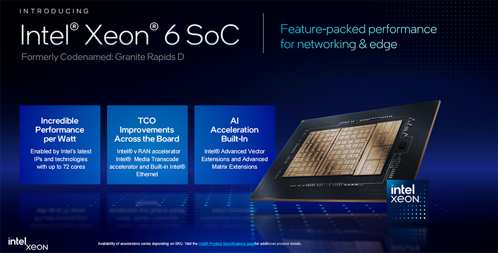 面向网络和边缘应用的英特尔至强6处理器是一款系统级芯片(SoC),旨在提供高性能和能效,凭借其内置的面向虚拟化无线接入网(vRAN)、媒体、AI和网络安全的加速器,满足对网络和边缘解决方案日益增长的需求。