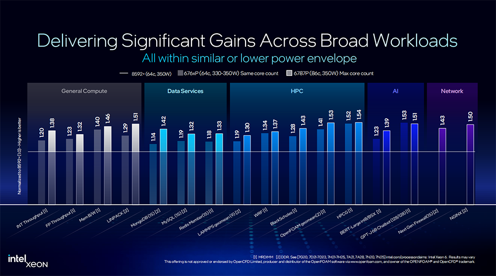 对比64核的第五代至强8592,64核和84核的至强6700性能核处理器在通用计算、数据服务、高性能计算(HPC)、AI、网络方面都有比较明显的提升。