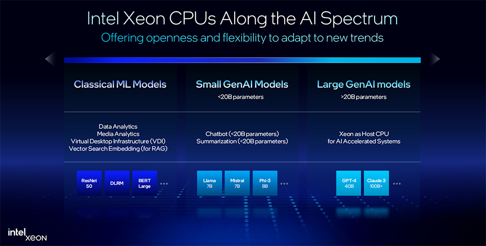 根据IDC数据,随着AI应用的日益普及,预计到2027年,各组织在生成式AI方面的支出将高达1530亿美元,而机器学习和分析的总支出将达到3610亿美元。英特尔至强6经过优化,在传统机器学习、小型生成式AI模型和GPU加速工作负载中提供出色性能。
