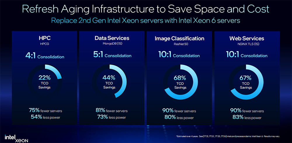 至强6处理器还具备出色的每瓦性能效率,以5年使用周期计,平均可以实现以1台新的服务器替代5台旧服务器,在某些用例中该比例可达10:1,从而节省高达68%的总拥有成本。