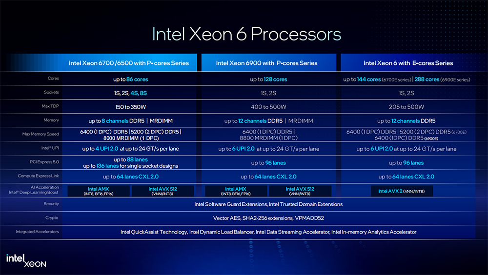 英特尔至强6700/6500性能核处理器,能够提供出色的性能与能效平衡。与上一代产品相比,至强6处理器在广泛的企业工作负载中实现了平均1.4倍的性能提升,TDP峰值为150-350W。