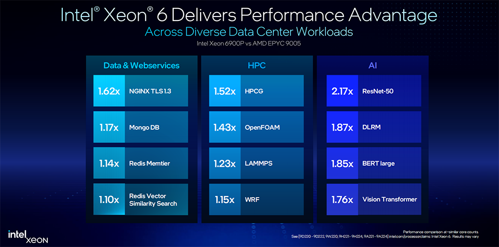 英特尔还补充分享了高端至强6900系列产品与竞品的性能对比,其中至强6900P在传统的数据和网络服务、科学计算、AI领域都展现出了更高的性能。