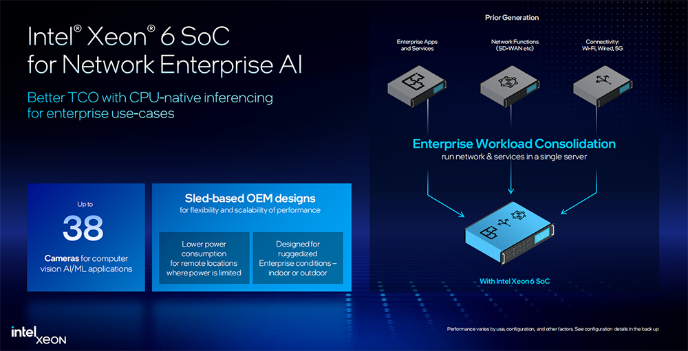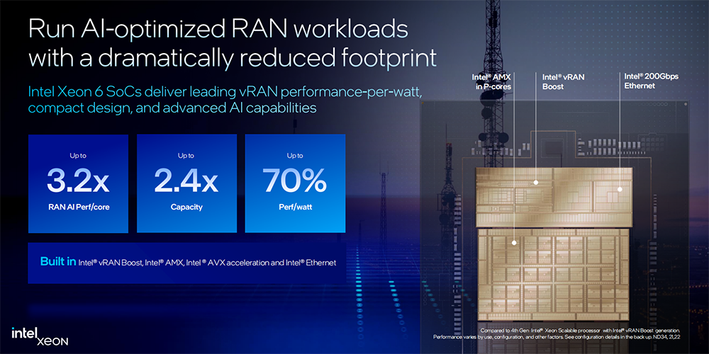 芯片创新是满足苛刻网络要求的关键。面向网络和边缘应用,英特尔发布全新至强6处理器SoC,内置英特尔vRAN Boost技术,可带来高达2.4倍的无线接入网(RAN)工作负载容量提升。